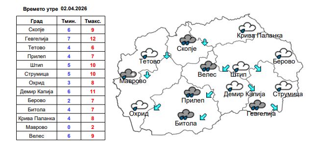 Облачно со пообилни врнежи од дожд (над 30 l/m²). На повисоките места врнежите ќе бидат од дожд и снег, додека на планините ќе паѓа снег. ❄️